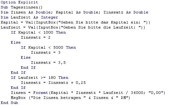 | Zins, Kapital und Zinssatz: | Datentyp Double, Wertebereich > 0 |
